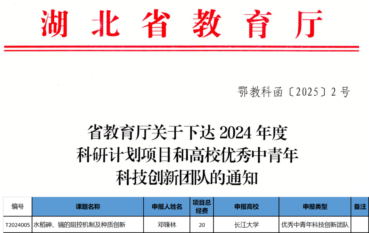 (通讯员 覃元)近日,省教育厅下达了2024年度湖北省高校优秀中青年科技创新团队和科研计划项目的立项通知,公司作物分子生理与进化团队牵头的“水稻砷、镉的阻控机制及种质创新”项目获批,负责人为邓锋林教授。这是公司已获批的第8个省级科技创新团队,涉及作物学和植物保护两个一级学科。