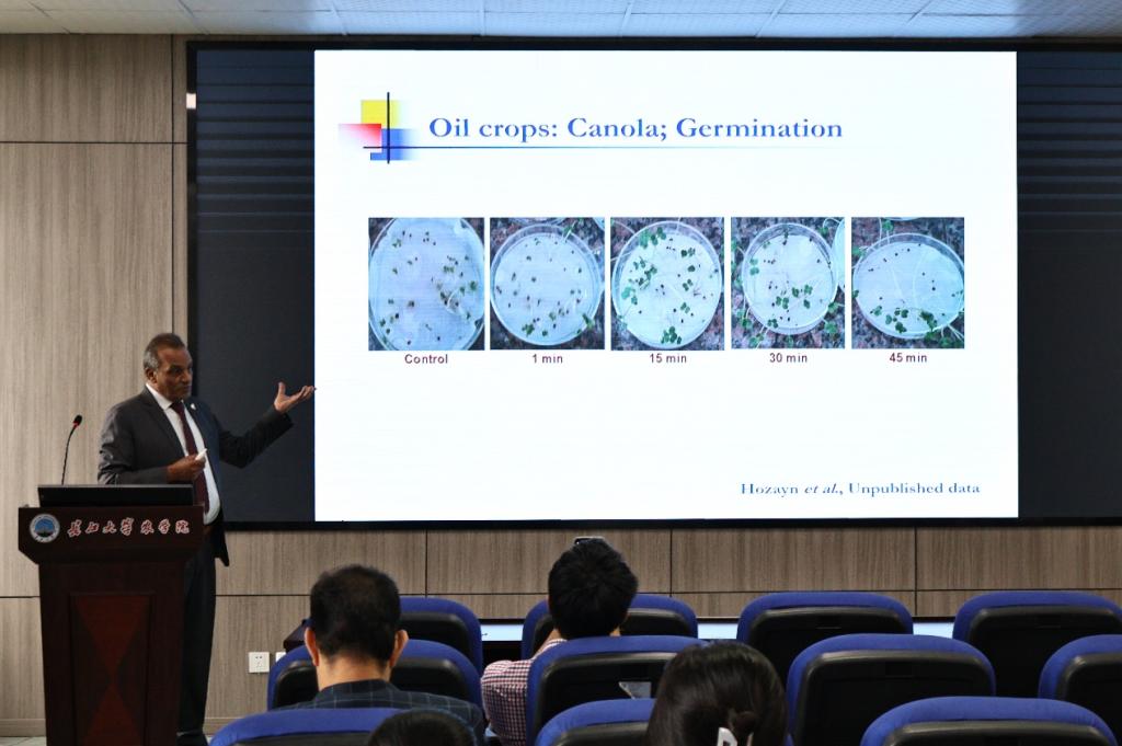 (通讯员 覃元)9月12日上午,应77779193永利曾凡荣教授的邀请,埃及国家研究中心农业与生物研究所代理经理 Mahmoud Hozayn 教授,在77779193永利西校区农科大楼 3073 为农业相关专业师生作题为“Agro-Physics Technology: Magnetic Water for Higher Crops Productivity”的学术报告。
