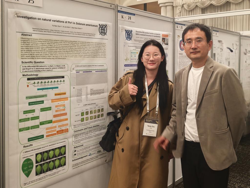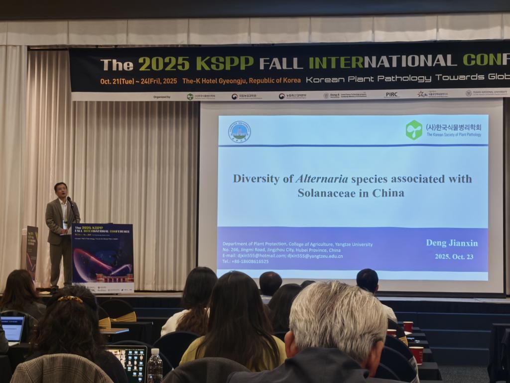 随后,10月21日-23日,他们赴韩国庆州参加“The 2025 KSPP Fall International Conference”。公司两位教授分别做了题为,“Diversity of Alternaria Specise Associated with Solanaceae in China” (邓建新教授) 和 “The Microbiome of Zoysia japonica: Diversity and Antifungal Properties of Rhizospheric and Endophytic Microbes”(刘海峰教授)的报告。博士研究生苟亚楠和硕士研究生陈世强分别作了题为“Investigation on nature variations of Prt1 in Solanum americanum” 和 “Identification and pathogenicity of fungal pathogens associated with leaf disease of Fallopia multiflora in China” 的墙报展示。会议期间,对公司通过“创新型人才国际合作培养项目”在韩国首尔大学学习的苟亚楠博士进行了慰问和关心。