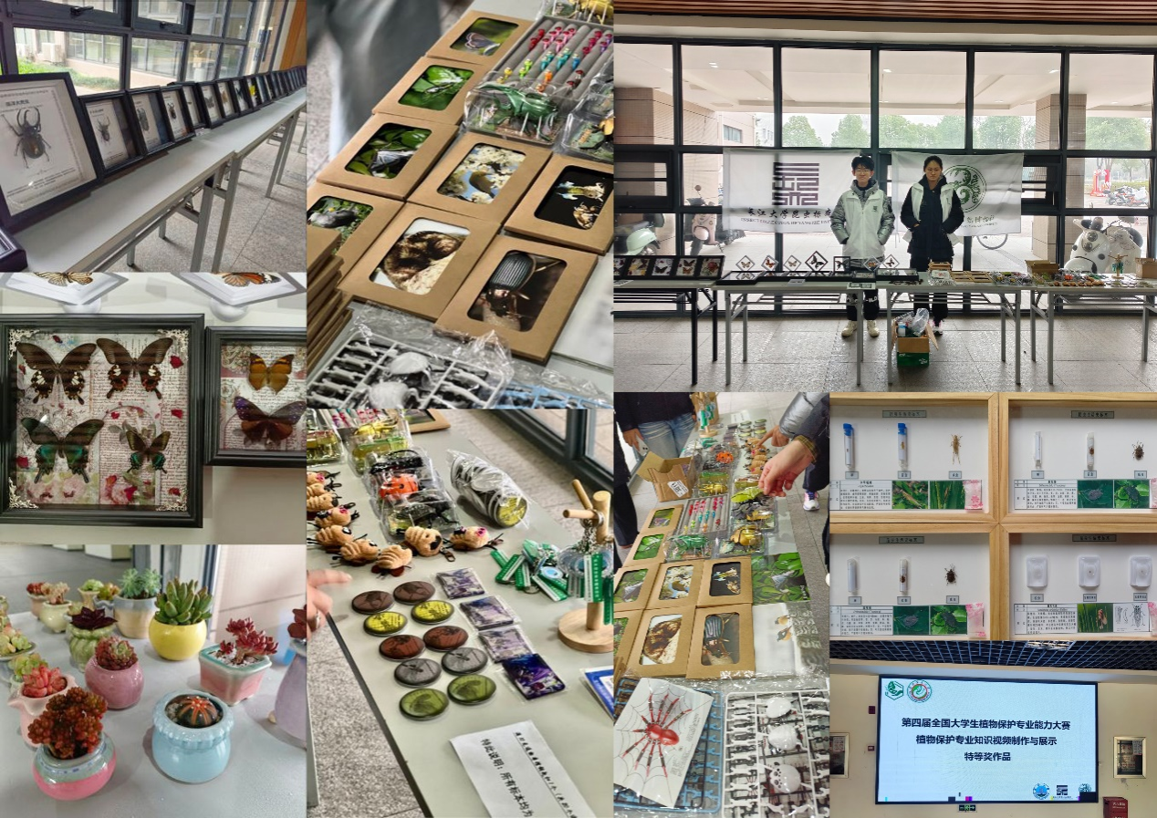 活动开始前,在植物保护系谢广林老师的指导下,员工团队高效完成了场地布置。农科楼大厅内,10个主题摊位错落有致,共同构筑了一个丰富多彩的“昆虫集市”,依次展示了精品昆虫标本、常见农业害虫生活史标本、昆虫标本馆主题文创、自然博物社特色周边、自制昆虫艺术品,以及多肉植物等琳琅满目的内容。在农科大楼大厅的大屏幕上,滚动播放着历届植保专业技能大赛中公司代表队的获奖短视频作品。与此同时,报告厅完成设备调试,农科楼内外显示屏准备就绪,标本馆内标本整理妥当,为活动开展做好了全面准备。