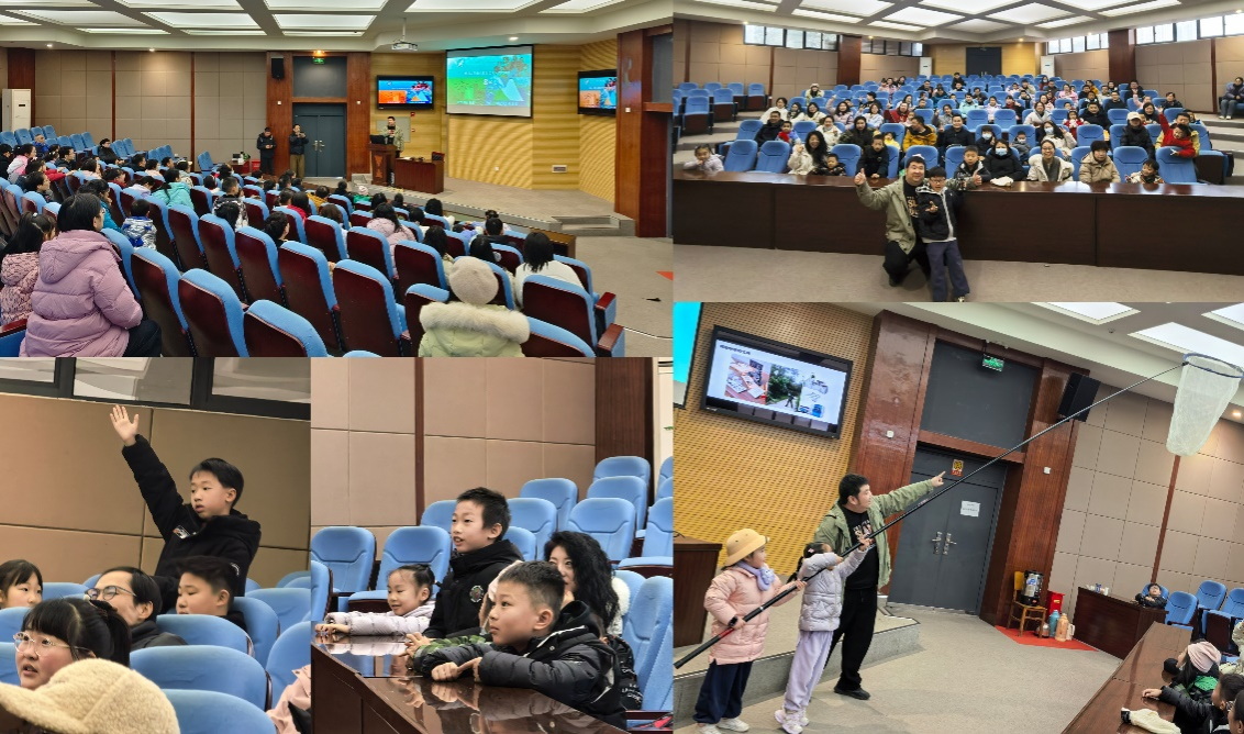 本次活动以昆虫标本馆科普负责人金振宇老师的《昆虫王国探秘》科普讲座正式拉开帷幕。通过生动有趣的语言和精美直观的图片,带领现场的大小朋友们走进奇妙的昆虫微观世界。讲座过程中,小朋友们积极踊跃地参与互动问答,争相分享自己对昆虫的观察与好奇。最后的模拟采集环节更是将气氛推向高潮——孩子们在指导下兴奋地挥动着长达6米多的昆虫采集网,现场充满了欢声笑语,孩子们的脸上洋溢着探索与发现的喜悦。