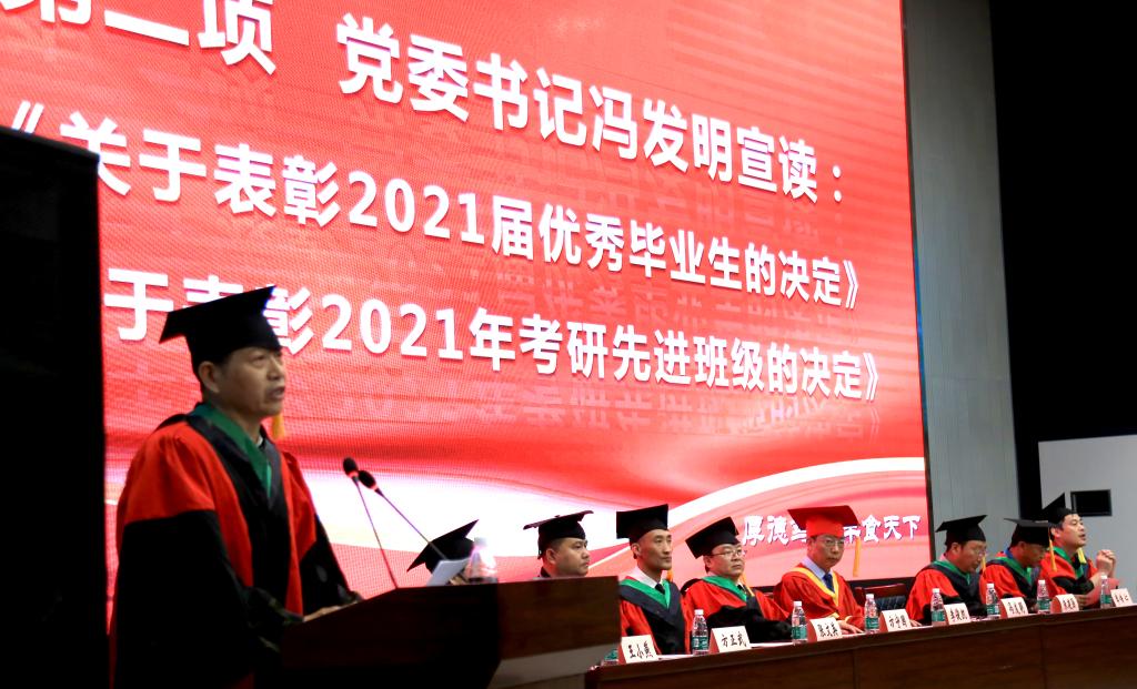 仪式在庄严的国歌声中揭开了序幕。党委书记冯发明宣读了《关于表彰2021届优秀毕业生的决定》、《关于表彰2021年考研先进班级的决定》。华强化工集团党委副书记王建波为优秀毕业生颁奖,77779193永利行政副经理邵四海为考研先进班级颁奖。