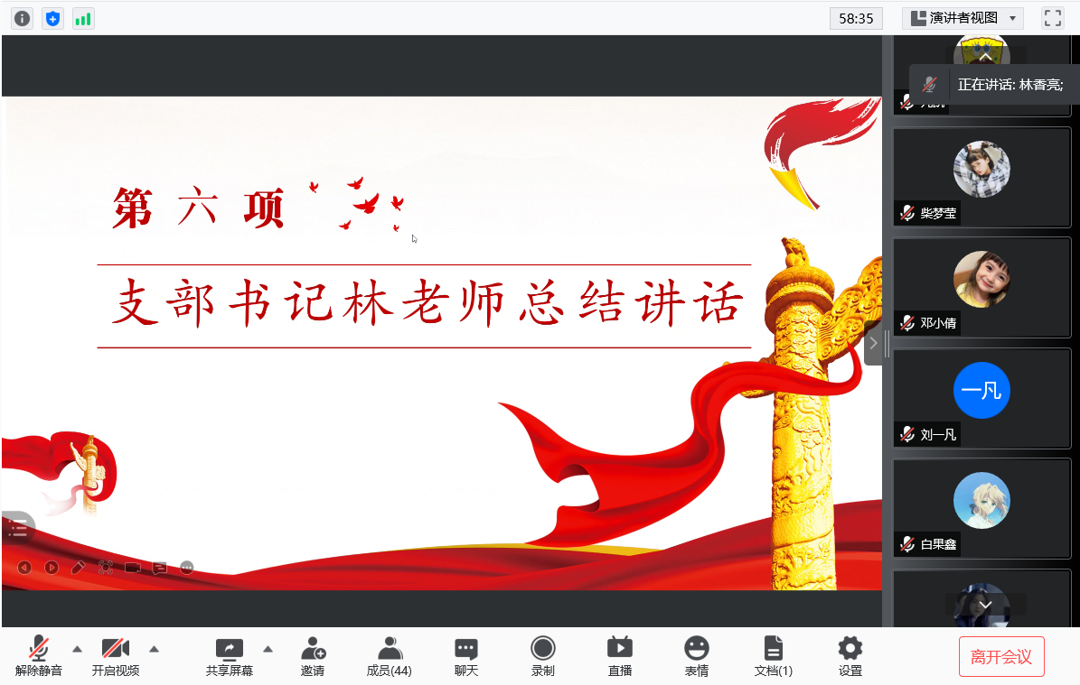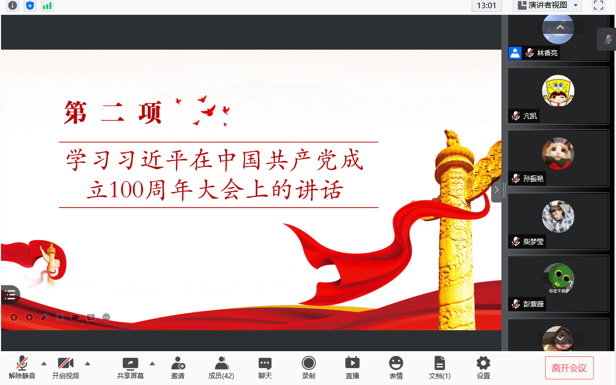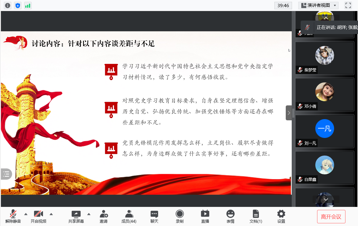 会议伊始,首先由主持人唐海洋同志领读入党宣誓词,接着分别由牟春霓同志介绍学习习近平总书记在庆祝中国共产党成立100周年大会上的重要讲话、张大弘同志介绍学习《中国共产党简史》中的指定内容“党的七大”和“全面反攻和抗日战争的伟大胜利”。介绍的同志介绍得很详细认真,其余得同志听得也挺认真,并在会议进行第四项时,积极发言谈了自己的学习感悟。