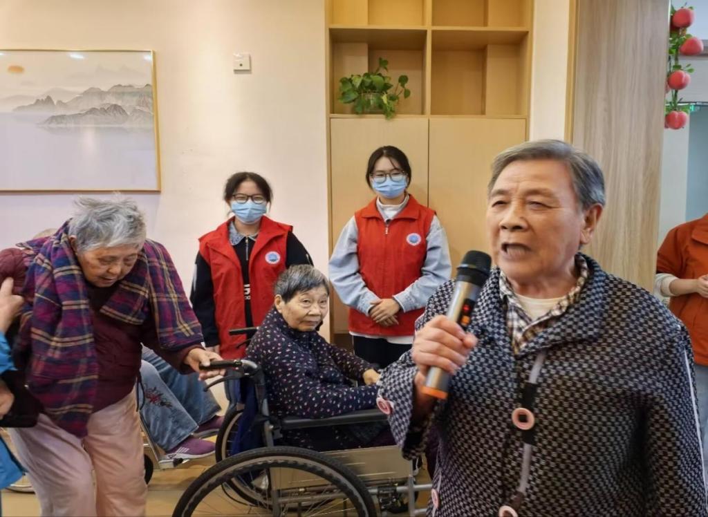 演出过后,趣味游戏“击鼓传花”热闹开启;鼓点响起,彩花在老人们手中欢快传递,鼓停时接到花的老人大方的向我们朗诵了一首诗歌,现场掌声与笑声此起彼伏,满是温馨热闹;游戏间隙,工作人员还为一位爷爷精心准备了生日惊喜,当生日歌缓缓响起,大家共同送上生日祝福,爷爷脸上洋溢着幸福笑容,整个养老院都被这份温暖与关爱包围。